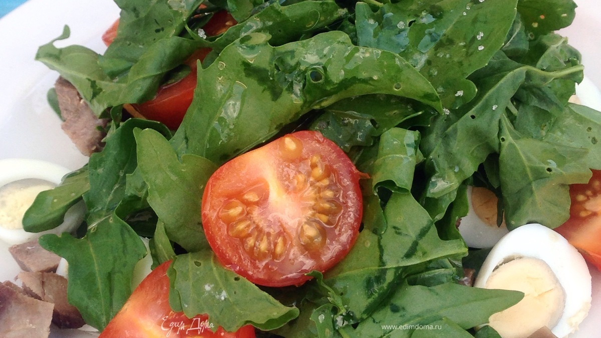 - ПодготовкаЯйца и помидоры-черри разрезаем пополам. Отварной говяжий или телячий язык нарезаем кубиками. Выкладываем все в блюдо, добавляем руколу.