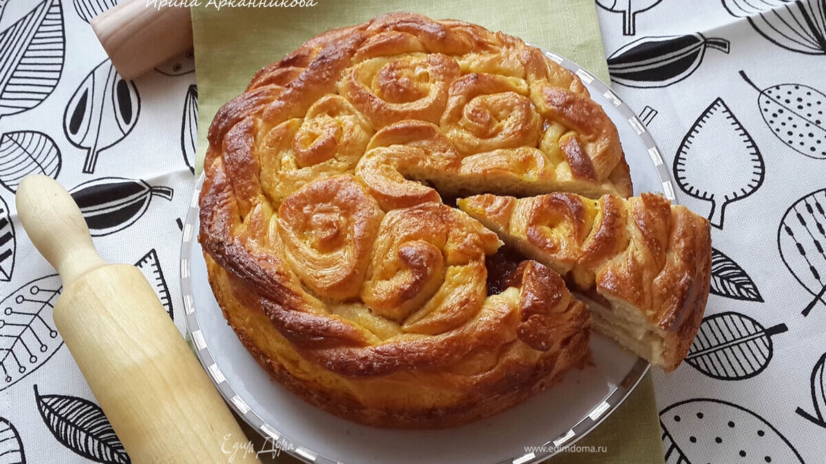 Выложить начинку. Украсить оставшимся тестом. Смазать желтком, смешанным с сахаром. Выпекать при 180°C около 50-60 минут.