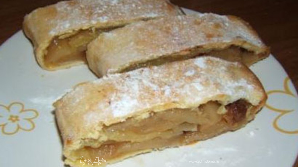 - Шаг 1Маргарин, творог, муку и 1ч.л. сахара смешай в однородную массу - тесто и раскатай в тонкий прямоугольный пласт толщиной 5мм Очисть яблоки и натри на крупной тёрке, добавь корицу, изюм, сахар и перемешай. Ровным слоем выложи начинку на тесто и заверни в рулет. Выпекай 30 минут при 200'. Чтобы сделать ванильный соус, вскипяти сливки с сахаром и ванилью, разведи крахмал в небольшом количестве холодной воды, влей в сливки. Доведи до кипения. Перед подачей штрудель полей соусом. Очень вкусно и довольно просто :)