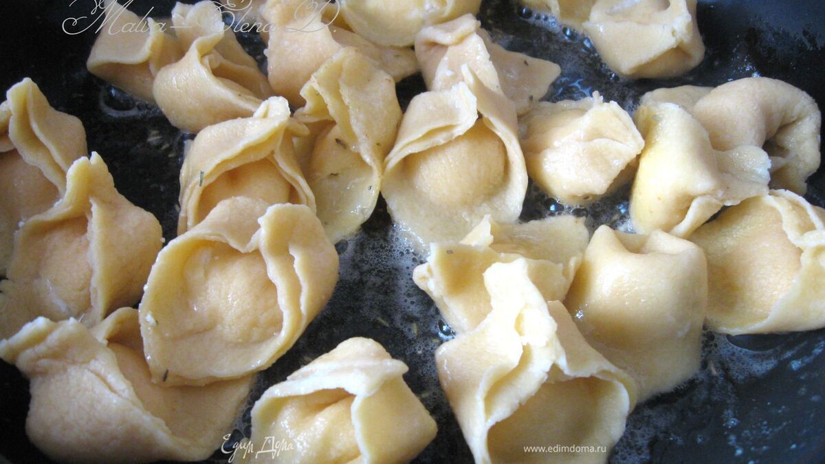 Поставить кастрюлю с водой на огонь (каппеллетти должно быть просторно в кастрюле), посолить. Когда вода закипит, опустить аккуратно их в воду, убавив огонь до среднего, на 2-3 минуты. В это время большую сковороду поставить на огонь, разогреть ее, положить кусочек сливочного масла, 2 зубчика чеснока (не измельчать!), сухой розмарин. Если у вас найдется веточка свежего розмарина, можете положить ее. Розмарин имеет очень яркий запах, поэтому не переборщите. Вынуть шумовкой каппеллетти, положить на сковороду и несколько минут подержать на сковороде на небольшом огне, чтобы они пропитались чесноком, розмарином и маслом. - Шаг 19