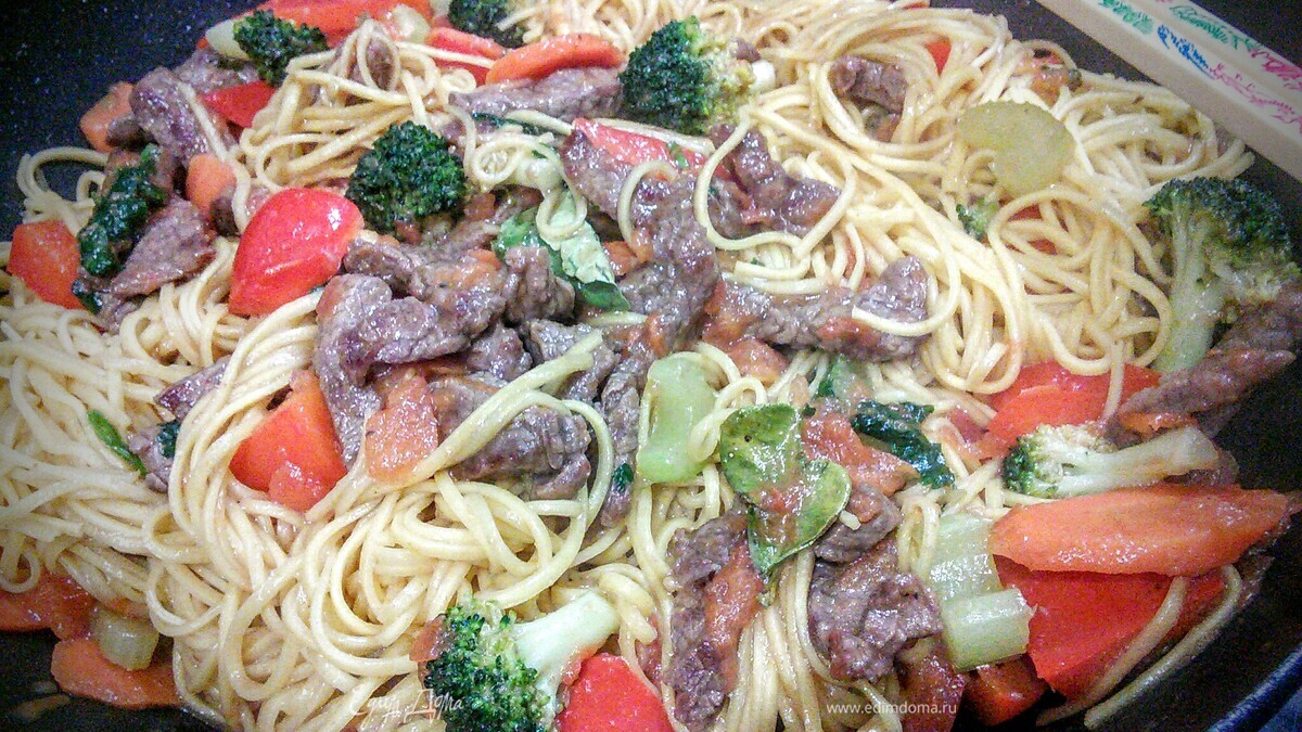 Добавьте овощи и обжаривайте мясо с овощами ещё в течении нескольких минут. В это время поставьте вариться лапшу (у меня "китайская").