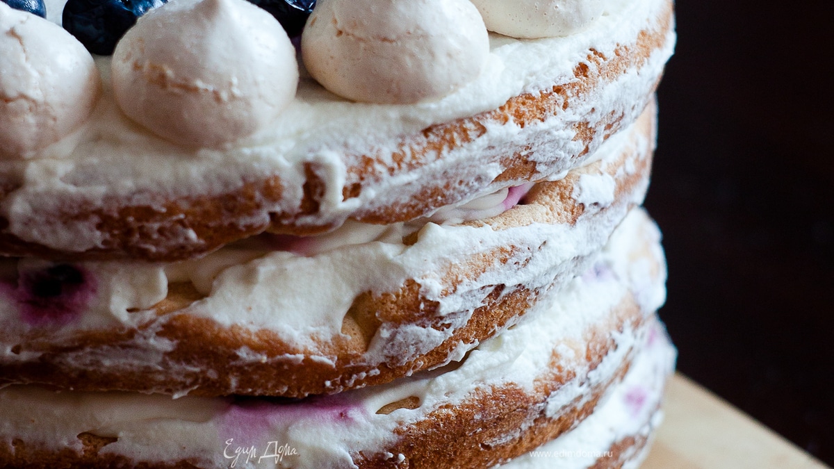 Собираем торт. Берем корж, пропитываем его сиропом, затем смазываем кремом, не очень густо выкладываем ягоды голубики, сверху ещё немного промазываем кремом, накрываем следующим коржом и повторяем действия. Самый верхний корж переворачиваем дном вверх — так верхушка будет ровнее, также пропитываем сиропом и смазываем кремом. Украшаем маленькими безешками и голубикой. Оставляем на ночь в холодильнике для пропитки.