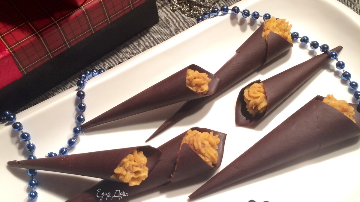На водяной бане растопить шоколад. Из пекарской бумаги свернуть кулечки в виде конуса. Растопленный шоколад заливаем в кулечек, обмазывая хорошо стенки, переворачиваем и даем лишнему шоколаду стечь. Этот процесс был самым сложным в процессе готовки, но и это выполнимо :). Укладываем конус на фольгу до полного застывания шоколада. Я для ускорения процесса положила конусы в морозилку, шоколад моментально застыл. - Шаг 5