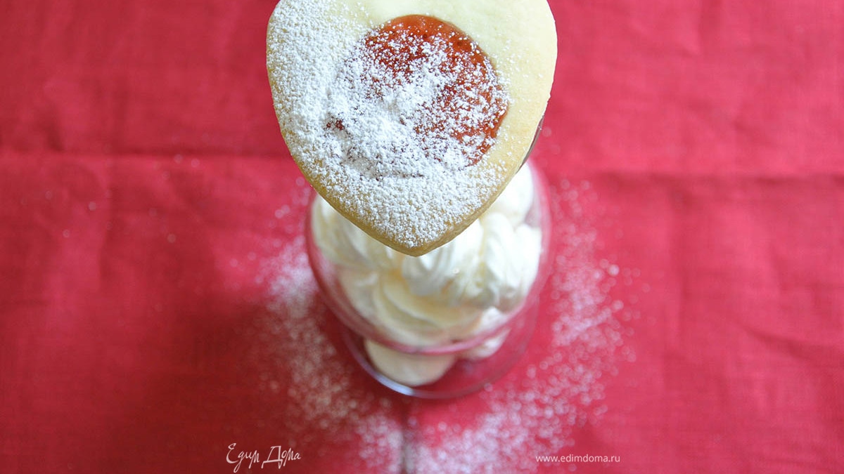 Обычное песочное печенье. Любой красный джем. Безе в бокале для украшения. Идеальное сочетание для дня влюбленных. Любите друг друга, дорожите, храните, уважайте! И пусть у вас все будет взаимно!