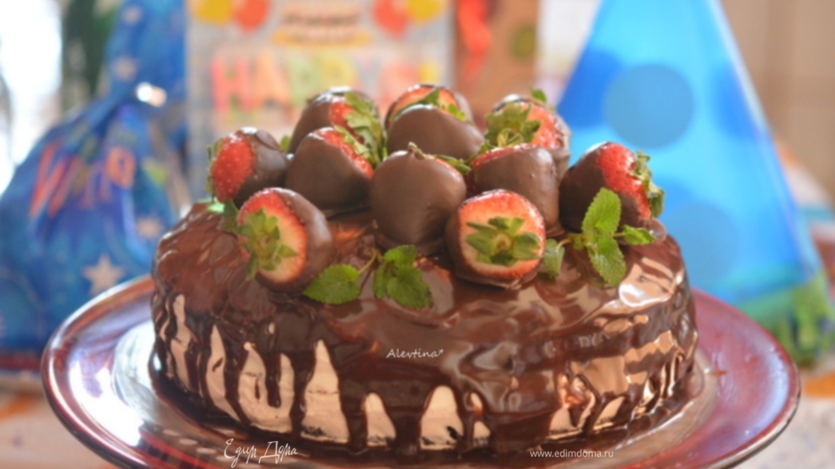 Бисквит на кипятке вероятно вам уже знаком и затруднений не будет. Для украшения я выбрала клубнику в шоколаде. Это так романтично и празднично и невероятно вкусно. Конечно не идеально все получилось, но все в домашнем стиле. Торт готовим заранее намеченного праздника.