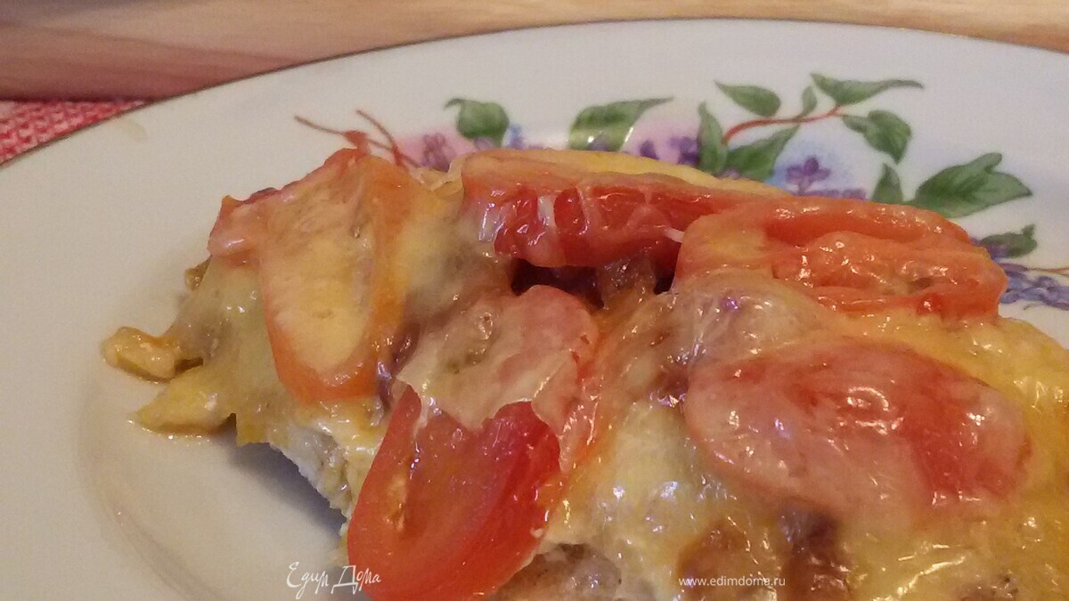 На филе выложить потом обжаренный лук. Потом помидоры и все посыпать сыром. Поставить запекаться в духовку на 40 минут при температуре 180°C.