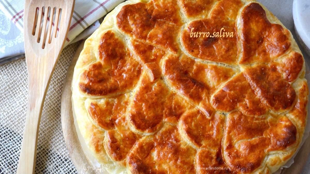 В форму для выпечки (у меня круглая, 28 см диаметром, но можно взять и прямоугольную) выложить пласт слоеного теста (у меня готовое). Наколоть тесто вилкой и выложить сверху начинку, разровнять. - Шаг 7