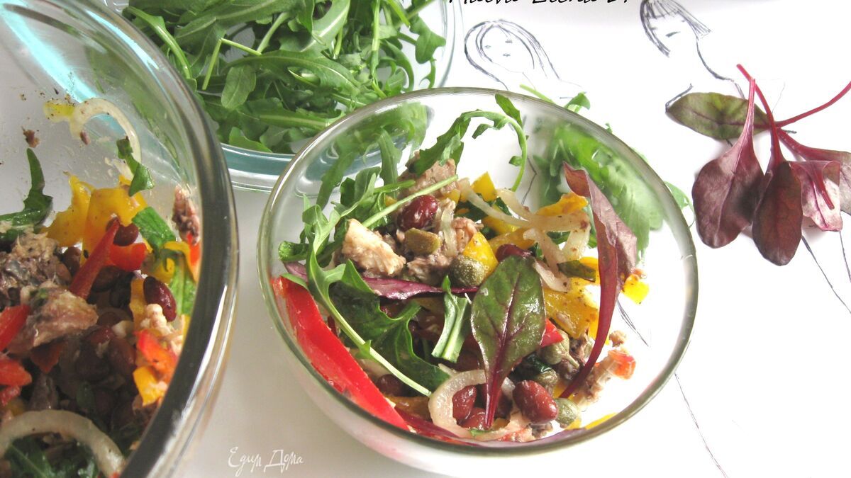 Смешать перец (красный и желтый), лук, каперсы, фасоль, лимонный сок, масло оливковое, соль, свежемолотый перец. - Шаг 3