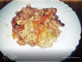 Вернуть часть говядины, обжарить всё вместе пару минут. Блюдо готово.