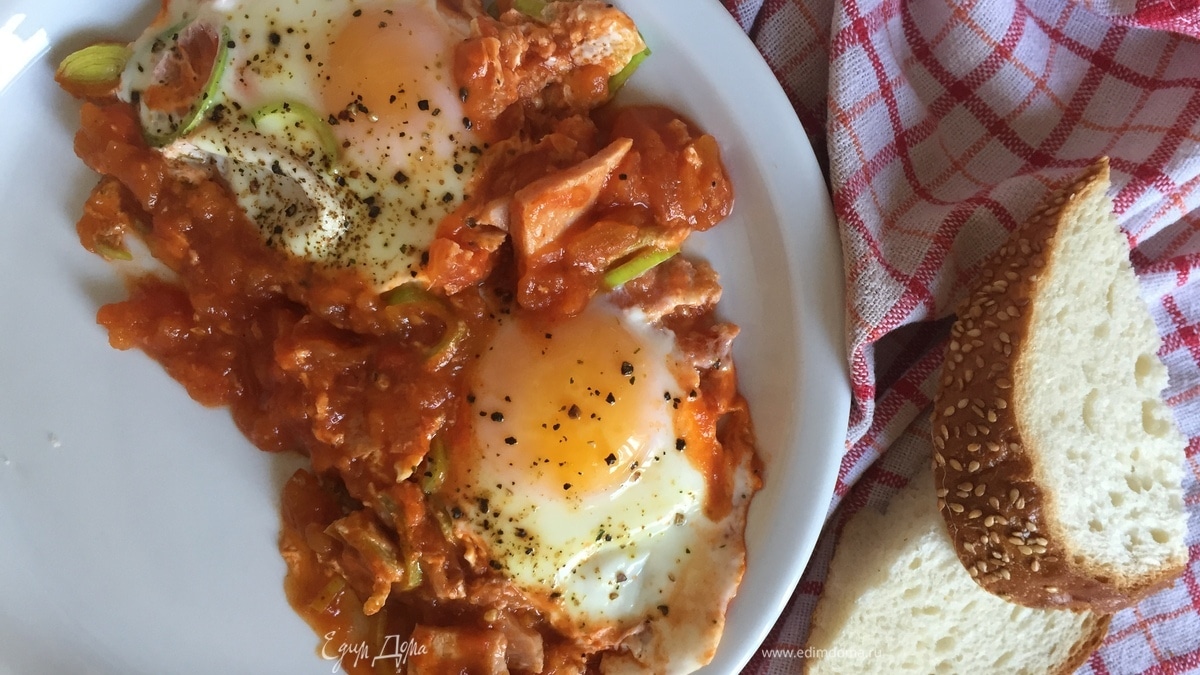 - Шаг 1Тем временем на разогретую сковороду выкладываем ветчину, выкладываем томатную смесь, перемешиваем и ставим на средний огонь. Визуально делим сковородку на 4 части и в каждую разбивает яйцо, как только белки схватятся выкладываем лук порей. Можно слегка прикрыть крышкой на 5-7 минут. Доводим до готовности на медленном огне. При желании можно посыпать сыром или подать его отдельно с свежим хлебом.