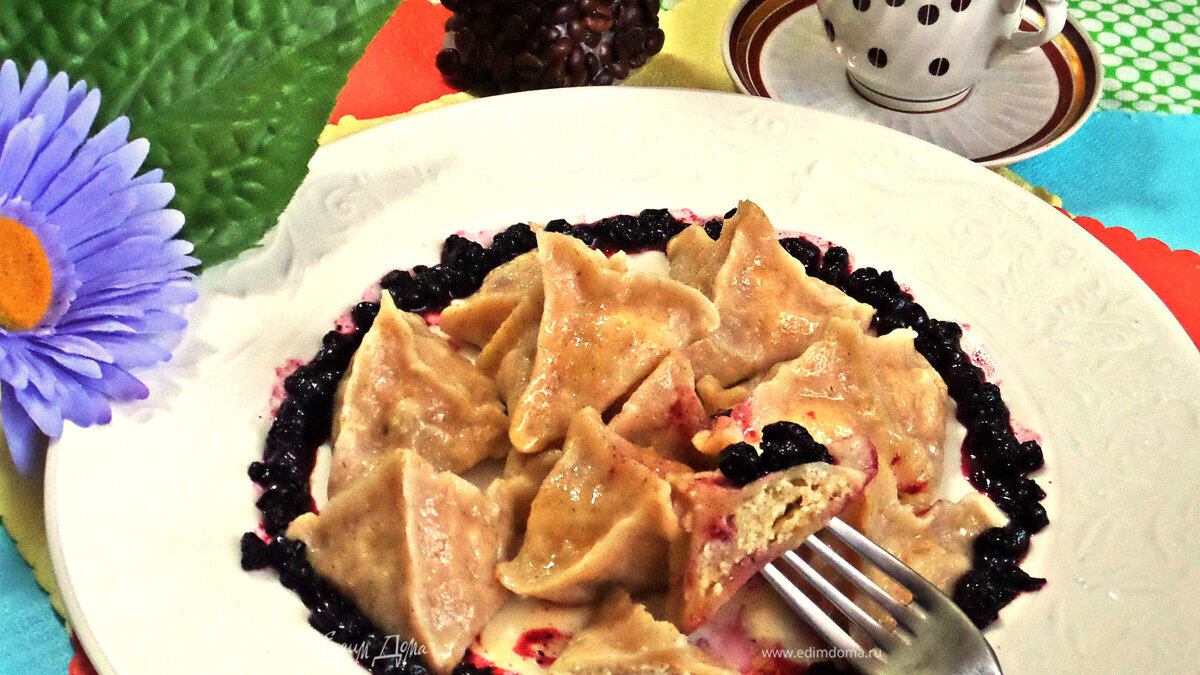 Для подачи наносим по краю тарелки черничное варенье и в центре насыпаем варенички. - Шаг 13