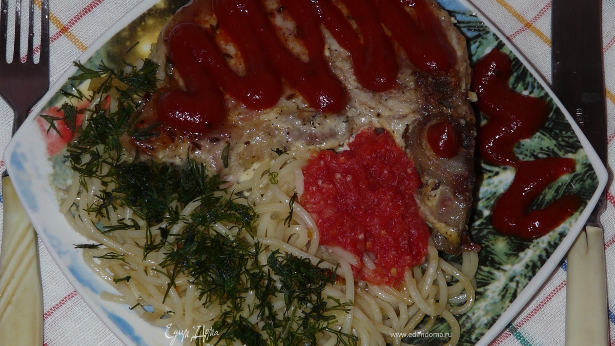 - Шаг 3По прошествии времени выключите духовку и так же оставьте рульку, чтобы немного остыла. После выложите на тарелку по кусочку свинины добавьте гарнир спагетти, по вкусу украсьте зеленью и добавьте соус (кетчуп). Блюдо готово — можно подавать к столу.