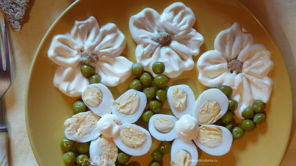 Возьмите красивую тарелку и выложите половинки в виде цветка ромашки желтками вверх, в серединку аккуратно добавьте горчицы. До полного оформления из легкого майонеза добавьте ещё в виде нескольких лепестковых цветков цветы, серединку так же можно сделать из капель горчицы. Для полного завершения композиции добавьте зеленого горошка в виде стебельков и листьев. Блюдо готово. Порадуйте детей!