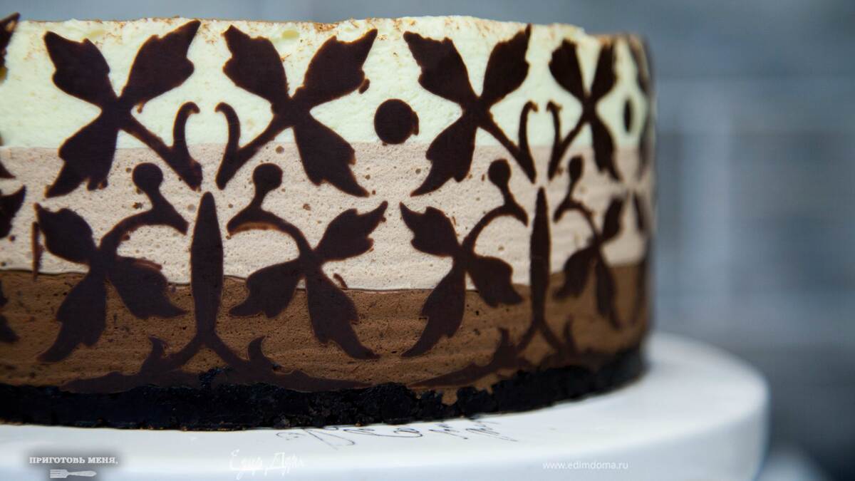 На этом торт готов. Но я решила ещё сделать ажурный бортик из шоколада. Для этого понадобится трафарет, пекарская бумага и немного шоколада или глазури. Растапливаем шоколад/глазурь, вырезаем по форме полоску пекарской бумаги. Сверху кладём трафарет и с помощью шпателя распределяем и убираем излишки шоколада по трафарету. Оставляем шоколад немного застыть. - Шаг 11