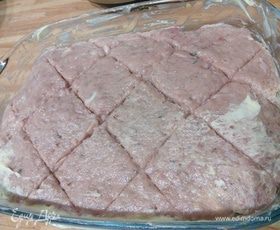 В идеале выпекается леберкезе в кирпичной форме для хлеба ёмкостью 1 литр, но подойдёт любая прямоугольная форма, имеющаяся в наличии. Её необходимо смазать маслом. Заполнить фаршем, тщательно разровнять поверхность и острым ножом сделать неглубокие надрезы (5 мм глубиной) в виде клетки.