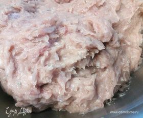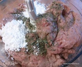 Измельчить в блендере мясо с беконом и луком до состояния колбасного фарша однородной консистенции. Чем мельче, тем лучше и однороднее будет фарш.