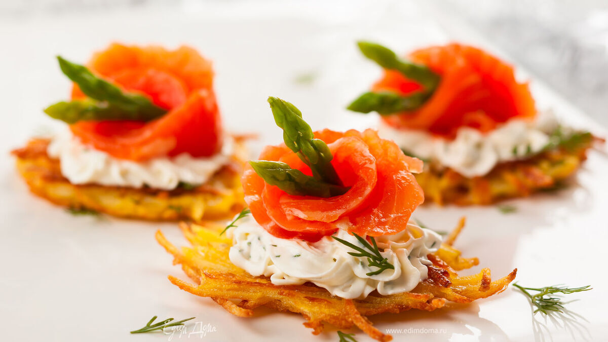 Припускаем спаржу. На приготовленные картофельные панкейки выкладываем творожный сыр, нерку и спаржу. Украшаем веточкой зелени.