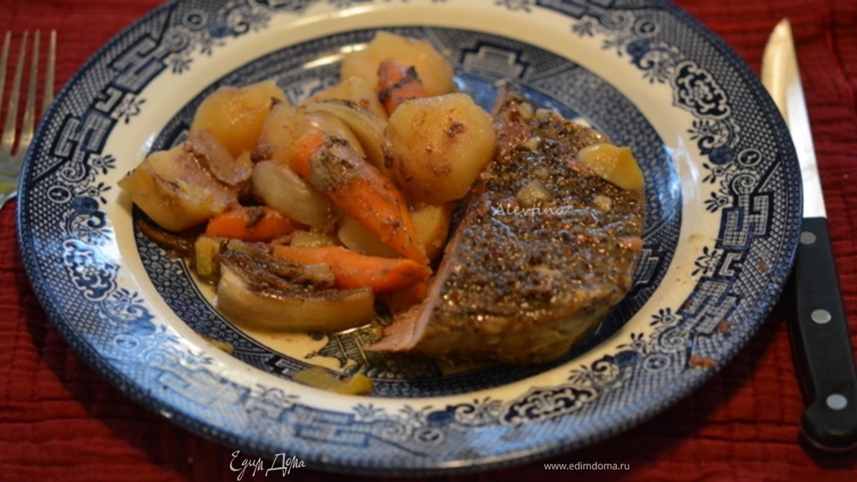 Говядину снять сверху . разрезать на части и подаем с овощами. Приятного аппетита.
