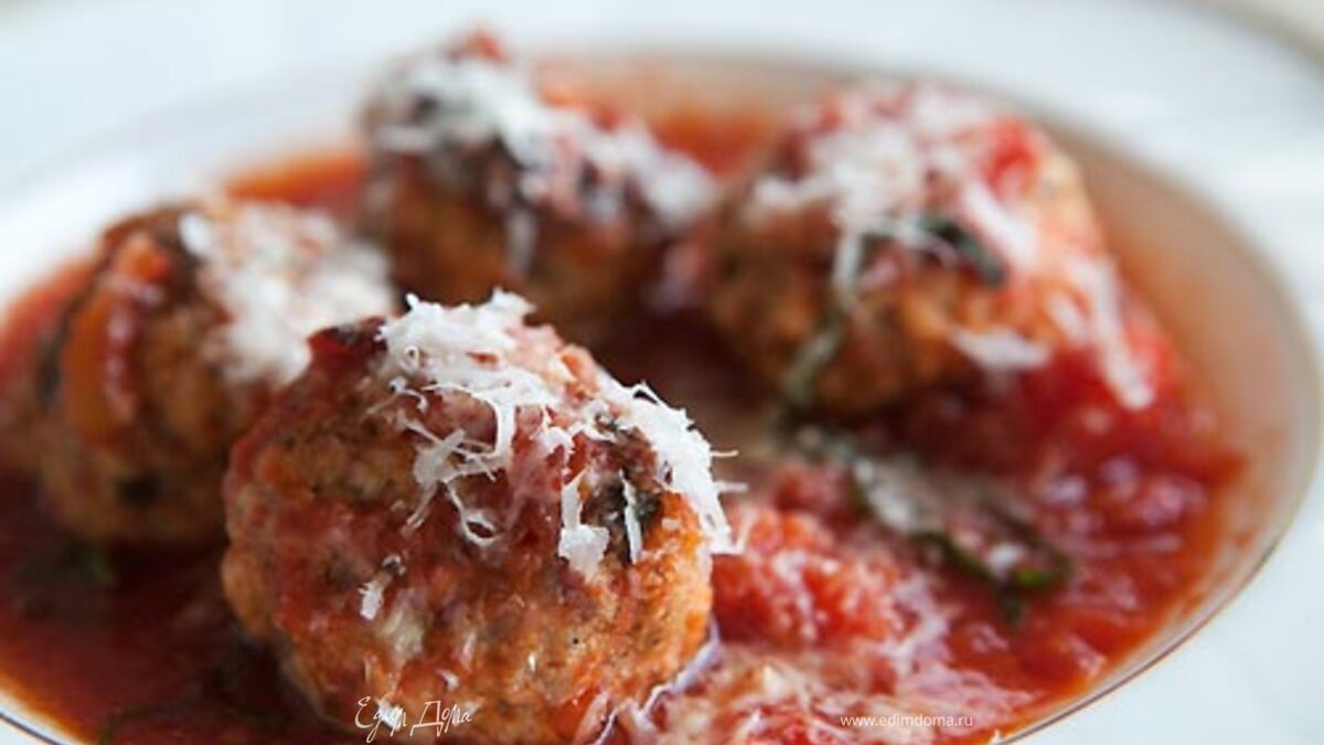 - ПодготовкаПомой морковку и сельдерей и измельчи. Помидорам дай стечь, сок собери в отдельную ёмкость, затем нарезать их крупными кубиками. Нарежь лук кубиками. 100г лука, 2 раздавленных зубчика чеснока, морковь, сельдерей и помидоры потуши в большом количестве оливкового масла. Добавь томатный сок, заправь солью и перцем и туши ещё 30 минут на маленьком огне. Анчоусы мелко поруби (если хочешь добавить зелень, то сейчас самый подходящий момент). Рубленую телятину перемешай с яйцом до однородной массы, туда же - оставшийся лук, панировочные сухари, анчоусы, (зелень), соль и перец. Из этой массы сделай 14-16 фрикаделек, обжарь их в горячем подсолнечном масле по 5 минут с каждой стороны до образования золотистой корочки. Подавай с томатным соусом.