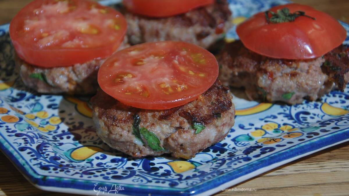 Рецепт интересный — в фарше вяленые помидоры, а сверху свежие. Готовый фарш хорошо подержать пару часов в холодильнике, но главное, чтобы он был однородным — должна получиться общая вкусовая композиция.