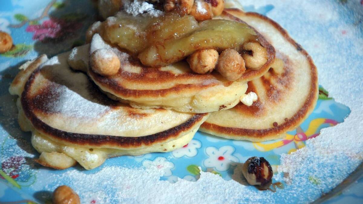 Готовые оладьи посыпать сахарной пудрой и подавать с карамелизированным бананом.