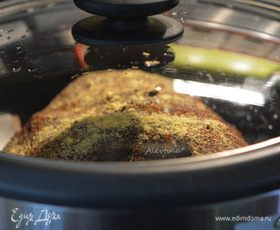 Выложить на дно медленноварки крупнонарезанный лук. Сверху кусок говядины комнатной температуры. Смешать все сухие специи. Обсыпать кусок говядины со всех сторон.
