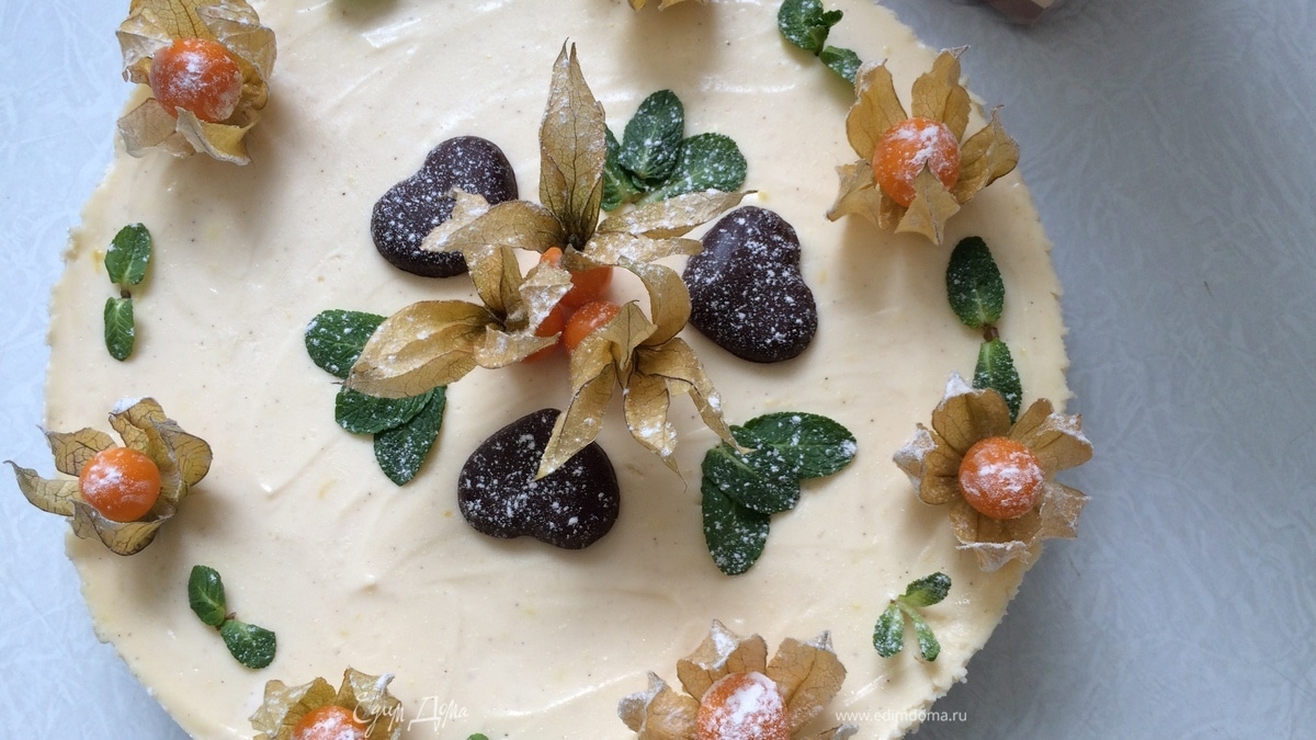 Утром достаем из холодильника, ножом, смоченным в воде аккуратно отсоединяем чизкейк от бортиков формы и снимаем форму. Украшаем на ваше усмотрение. Я украшала физалисом, мятой и шоколадными сердечками. Все были в восторге от этого десерта! Приятного чаепития!