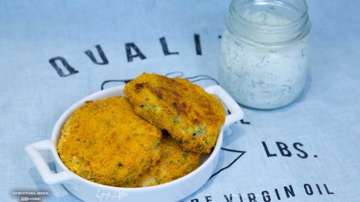Обжарить котлеты в масле по 5 минут с каждой стороны. Затем запечь при температуре 200°C 8-10 минут. Для соуса смешать сметану с чесноком и укропом.