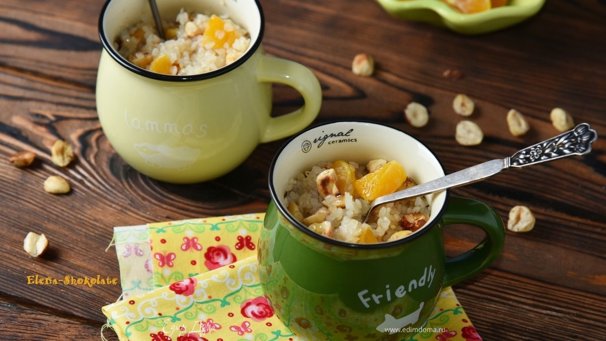 Разложить по пиалам, добавить орехи, кусочки мандарина и полить медом. Угощайтесь! Быстро, очень вкусно и полезно.