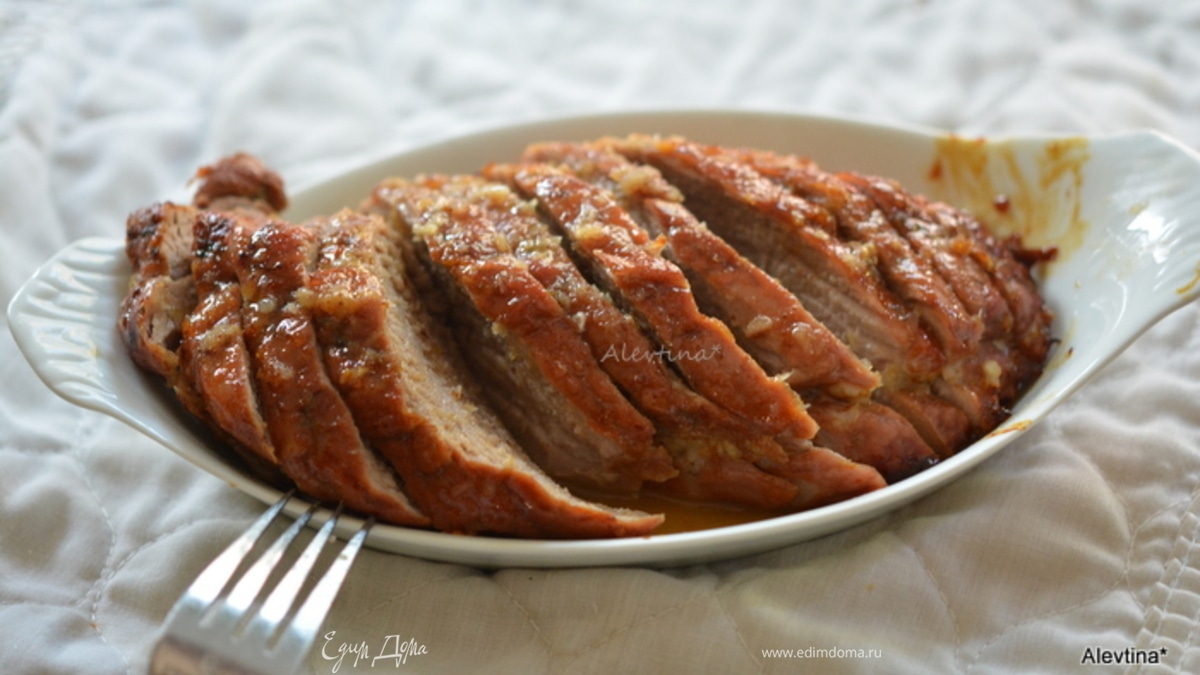 Готовую свинину достать из духовки. Дать постоять 10 мин. Разрезать на порции. Полить остатками глазури. Подаем к столу. Приятного аппетита.