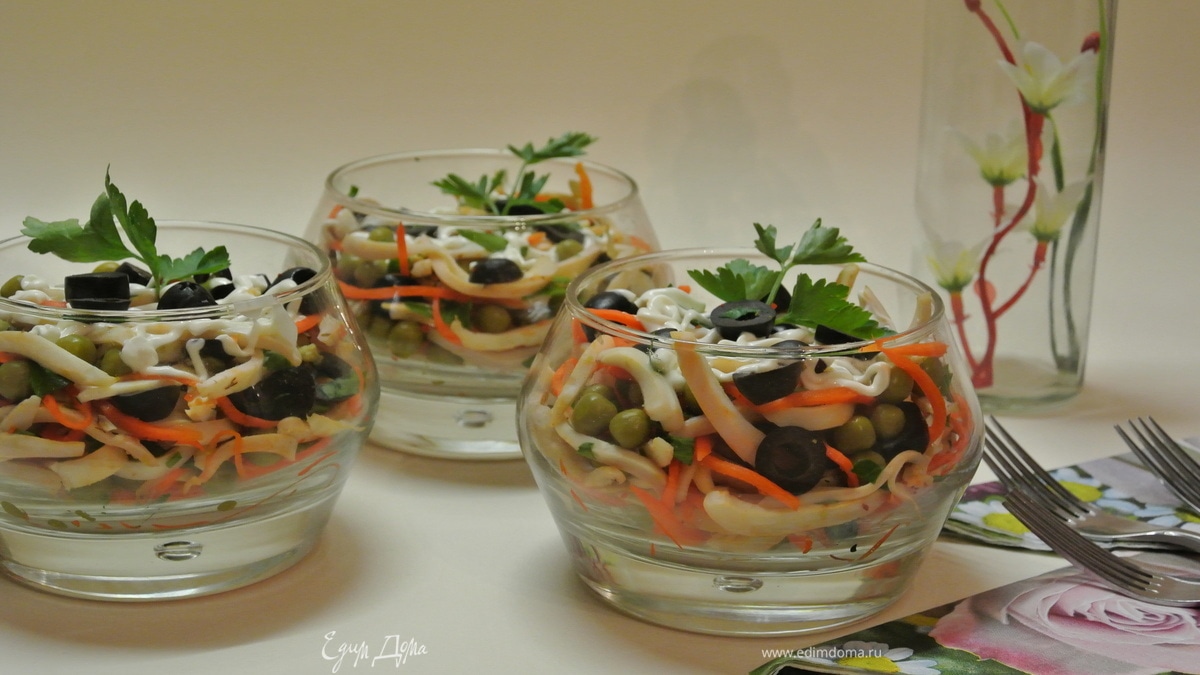 Рецепт этого салата я увидела в кулинарной газете «Смак» много лет назад, приготовила, очень понравился, так как я люблю блюда с кальмарами и другими морепродуктами. Приготовила салат и до сих пор продолжаю готовить)