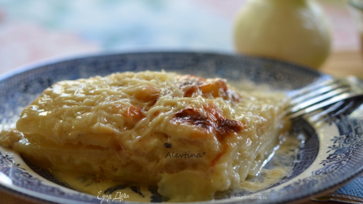 Выложить часть картофеля, посолить и поперчить, мускатный орех, затем половину лука, тертый сыр. Повторить также со вторым слоем, сливки с молоком, картофель, специи и лук, сыр протертый. - Шаг 4