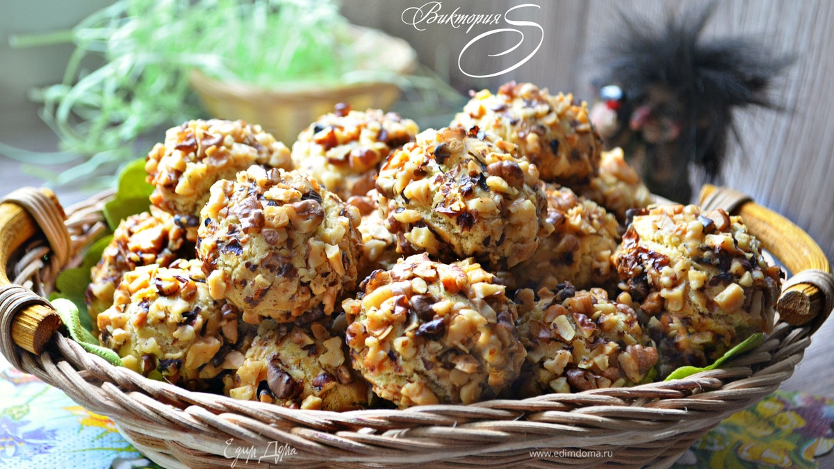 После охлаждения отсоедините по небольшому кусочку теста и скатайте шарик величиной с грецкий орех. Всего должно получиться 22-24 шт. Белки слегка взбейте вилкой. Орехи крупно порубите. Каждый шарик обмакните вначале в белок, а затем равномерно обваляйте в орехах, слегка прижимая их к тесту. - Шаг 2