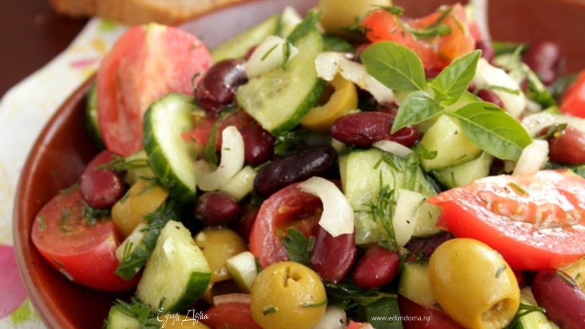 C фасоли слейте жидкость, лук нарежьте полукольцами, добавьте оливки.