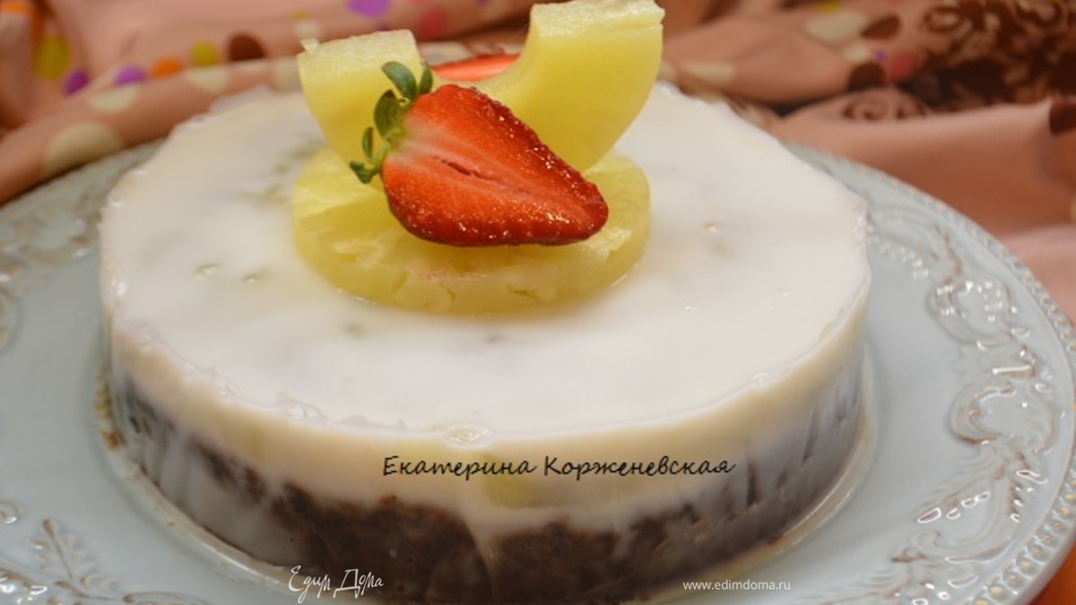 Готовый бисквит достать, извлечь из формы и остудить на решетке. - Шаг 3Готовим ананасовое желе. Консервированный ананас измельчить в блендере до однородного состояния. Добавить пудру, агар и какао-бобы. Перемешать и дать постоять 20 минут. Нагреть до кипения и варить 3 минуты, периодически помешивая.