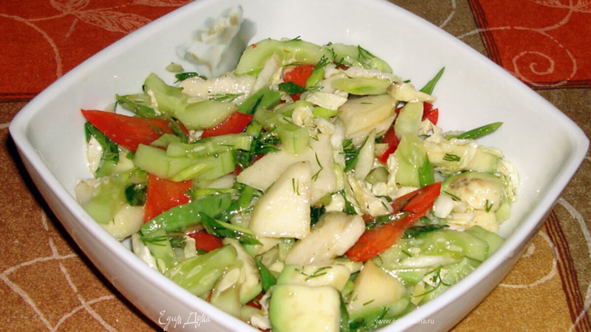 - Шаг 1Авокадо очистить, нарезать небольшими тонкими пластинками, сбрызнуть лимонным соком. Огурец очистить, нарезать соломкой. Грушу очистить, нарезать небольшими тонкими пластинками по размеру близкими к кусочкам авокадо. Перец нарезать тонкими ломтиками. Лук нарезать наискосок небольшими «перьями». Укроп нарезать помельче. Все сложить в салатник, подсолить, полить оливковым маслом, перемешать. Приятного аппетита!