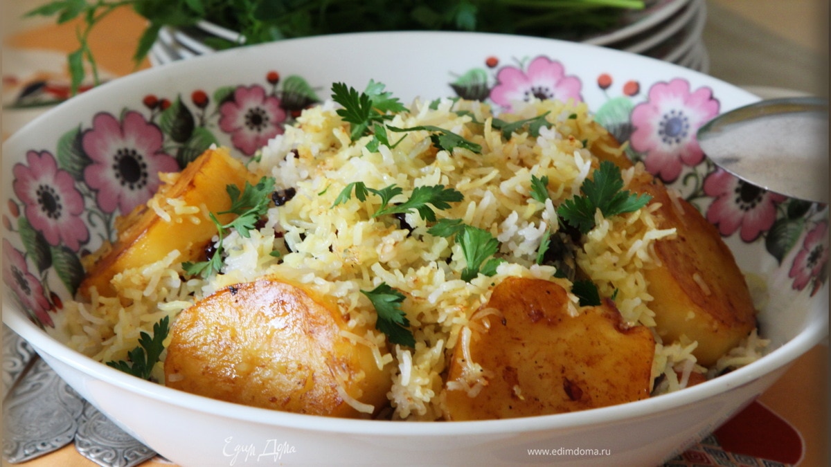 Выкладываем плов в блюдо, сверху картофель и подаем. Смачного! Получается очень вкусно. У кого нет шафрана, в оригинале предлагается пользоваться куркумой.