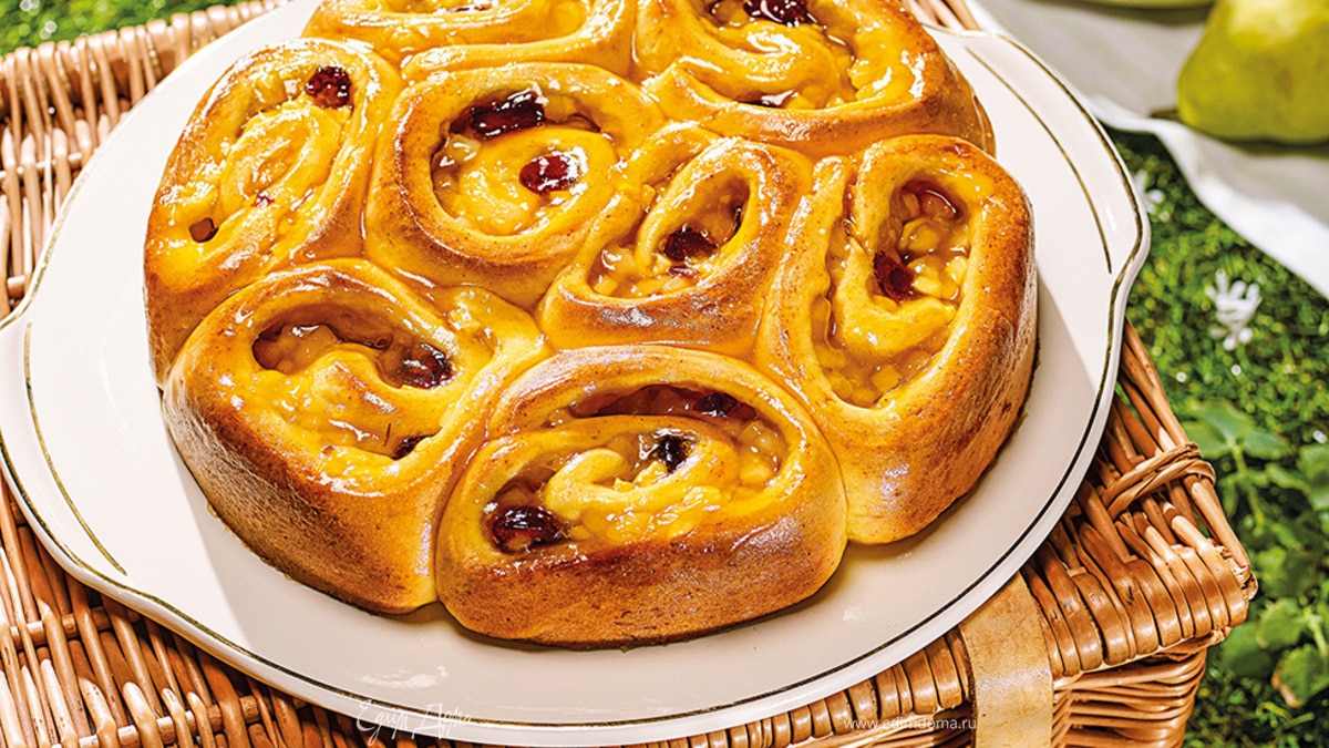 На слегка присыпанной мукой рабочей поверхности размять тесто и раскатать его в прямоугольник 40 на 30 см. Равномерно выложить начинку так, чтобы оставался отступ от краев около 2 см. Прямоугольник теста скатать с длинной стороны в рулон и разрезать на 8 одинаковых кусочков. - Шаг 4