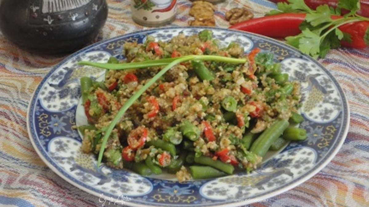 Вмешать все компоненты приправы — орехи, лук, специи, винный уксус, соль, мелко измельченный чеснок, зелень и все соединить с фасолью.