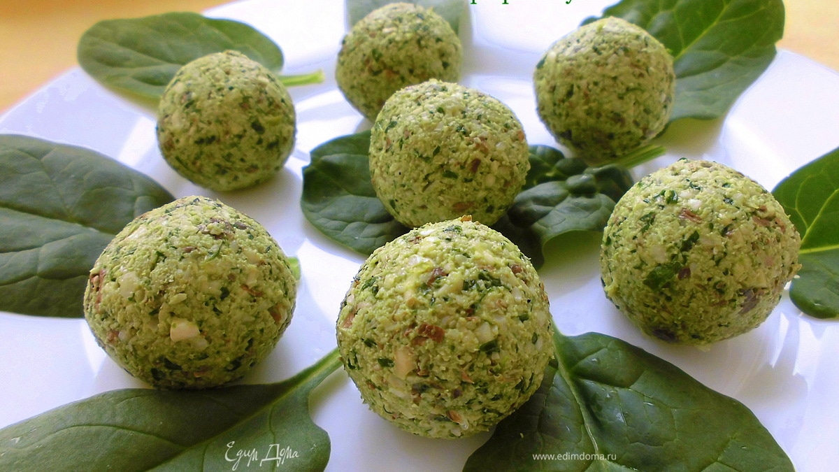 Скатать шарики размером с грецкий орех (или оставить все, как есть и подавать просто в виде паштета), выложить их на листья шпината и подавать. Приятного аппетита!