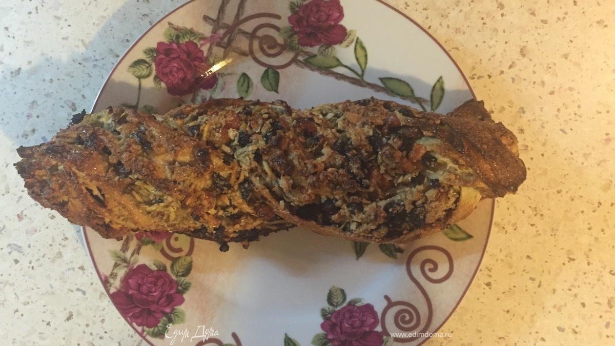 - Шаг 1Раскатать пласт теста, посыпать сахаром и корицей. Выложить послойно орехи и фрукты, скатать рулет. Согнуть рулет под углом 30-40°, разрезать половинки вдоль оставив в конце соединенными и переплести в косичку. Смазать яйцом, присыпать сверху сахаром (по желанию). Выпекать 30 минут при 200°С.