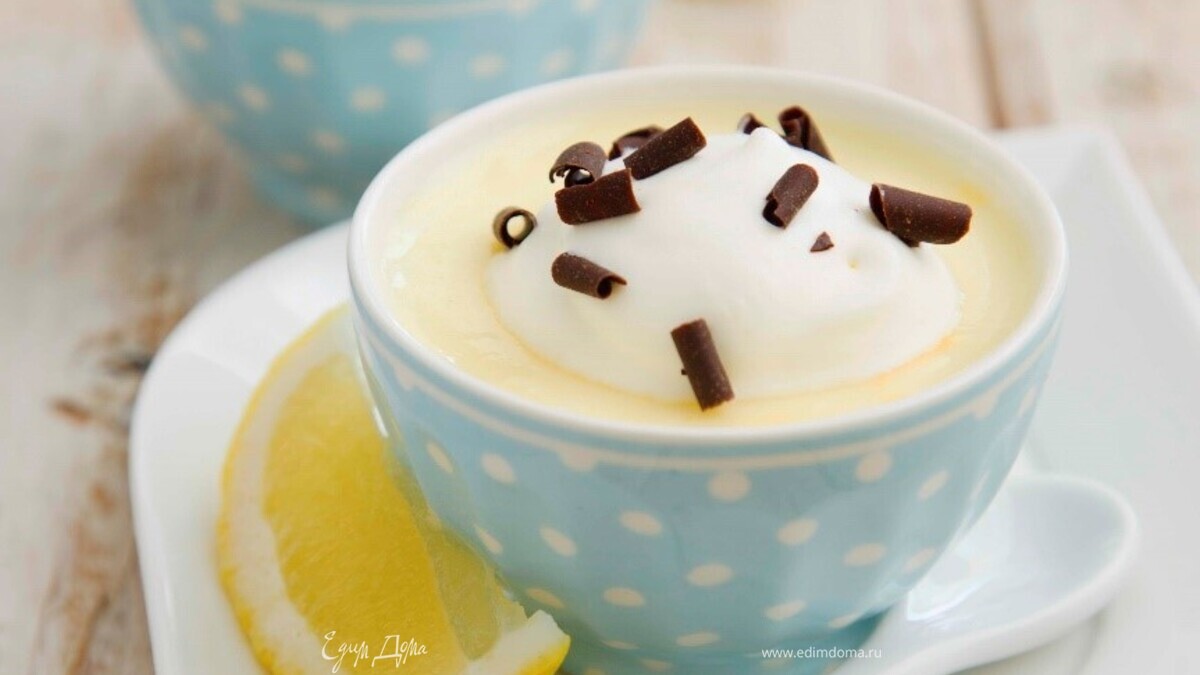 - Шаг 3Взбить небольшое количество сливок с 1 ч.л. сахара. Выложить на лимонный крем, посыпать шоколадной стружкой.