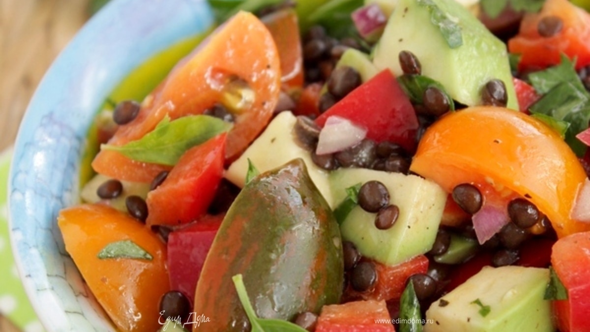 Очень яркий салат получился! Сытные чечевица и авокадо хорошо дополняются яркими и сочными томатами и перцем. 😋