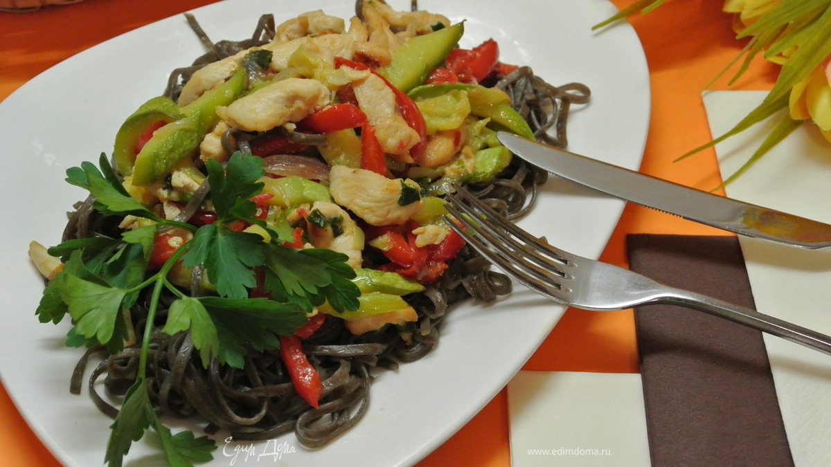 Разложить собу по тарелкам, сверху выложить курицу с овощами.