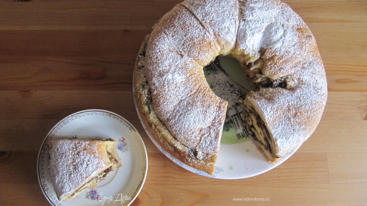 Свернуть пласт теста в длинный рулет и поместить его швом вниз в предварительно смазанную сливочным маслом форму с центральным отверстием. Отправить в предварительно разогретую до 180°C духовку на 40-50 минут. Время выпечки определяйте по своей духовке. - Шаг 7