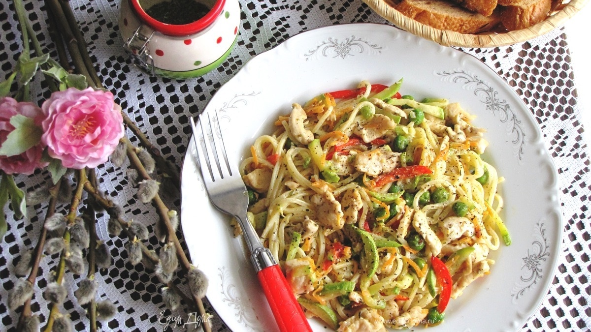 Давайте приготовим легкое итальянское блюдо с весенними овощами — кабачками, сладким перцем, зеленым горошком, морковью. ![]()