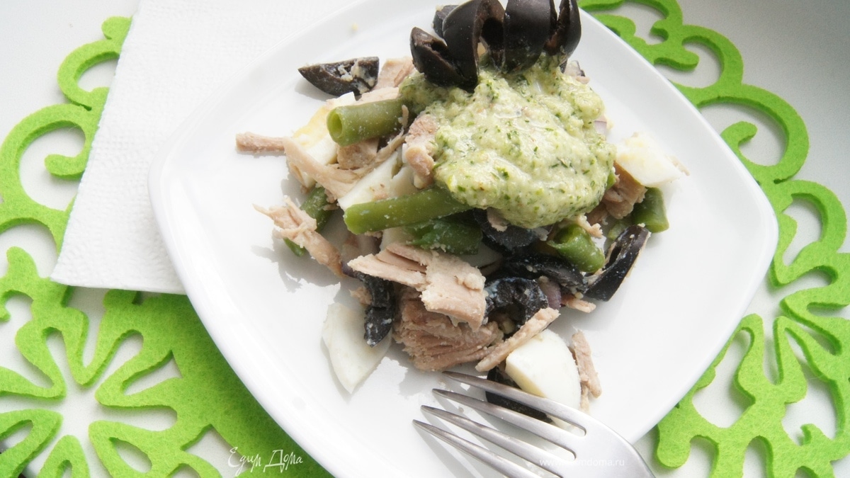 Добавить отварную стручковую фасоль. Перемешать, заправить зеленым соусом песто и можно подавать к столу.