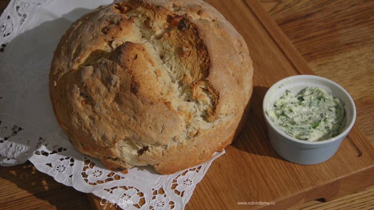 Домашний хлеб с курагой, орехами и зеленым маслом