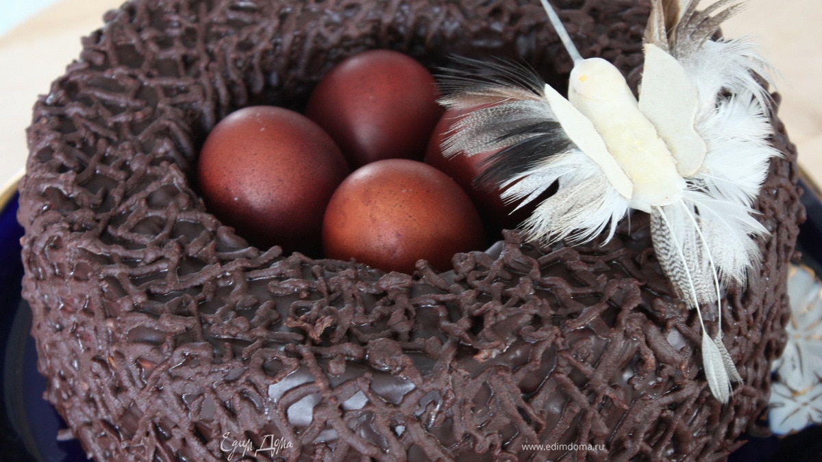 Шоколад растопить на водяной бане. Добавить масло и молоко. Перемешиваем все до однородной массы. Покрываем кулич глазурью при помощи силиконовой кисточки, даем ей полностью застыть. Оставшуюся глазурь перекладываем в корнет, сделанный из пищевой бумаги/пергамента. Хаотично наносим шоколадные полоски на кулич, имитируя плетеное гнездо. - Шаг 4