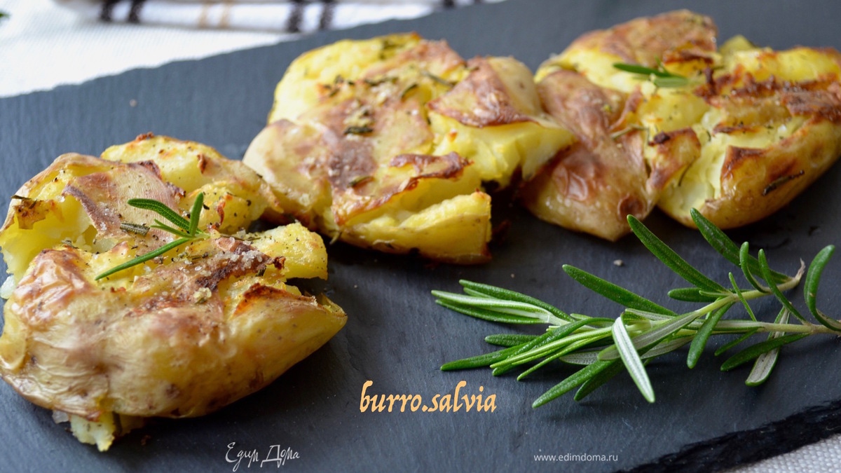 Давилкой для картофеля слегка придавить каждую картофелину сначала в одном направлении, а затем повернуть поднос на 90 градусов и еще раз осторожно придавить картофель. Вот и все!